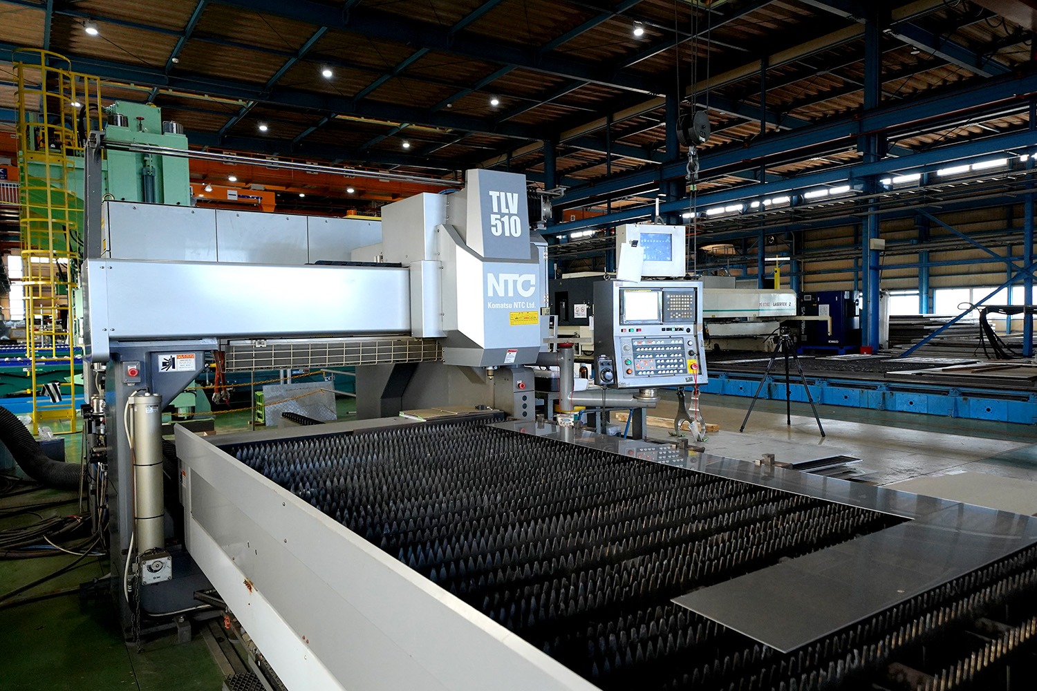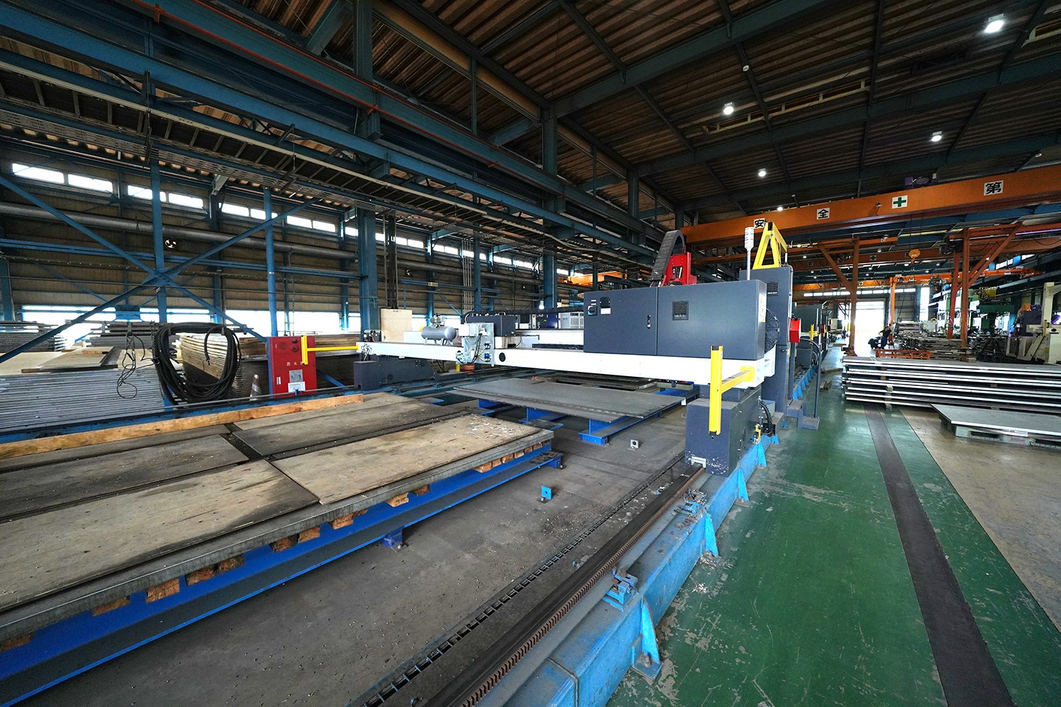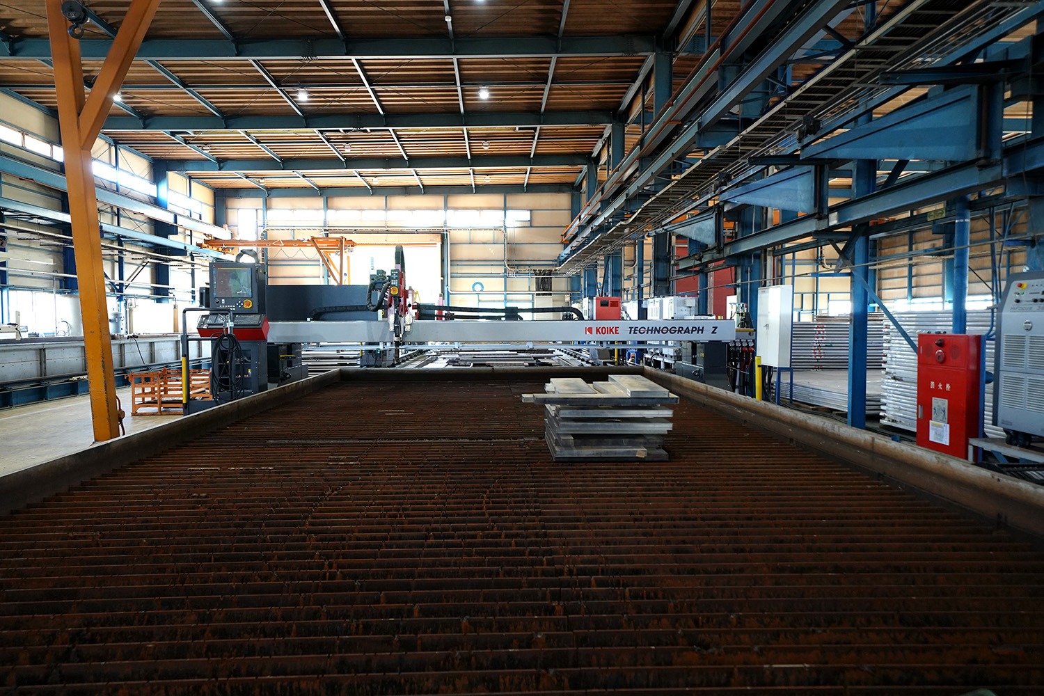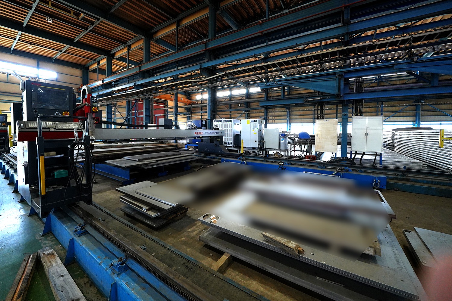 メーカー 小池酸素工業(株) 部門 素材切断部門 機種 プラズマ 仕様 テーブルサイズ:3.2m×9m 出力:600A 工場クレーン最大:10.0t 内容 板厚に応じて280A/440A/600Aの切り替えができます。厚板の切断や、ドリル機とプログラムを共有して作業を行うことができます。 切断能力:板厚16mm~35mm(280A)、板厚38mm~80mm(440A)、板厚80mm~110mm(600A) 最大製品サイズ:3m×7m 公共関係(ダム、水門、半導体製造設備部材 等)の大きい製品の切断も可能です。 -