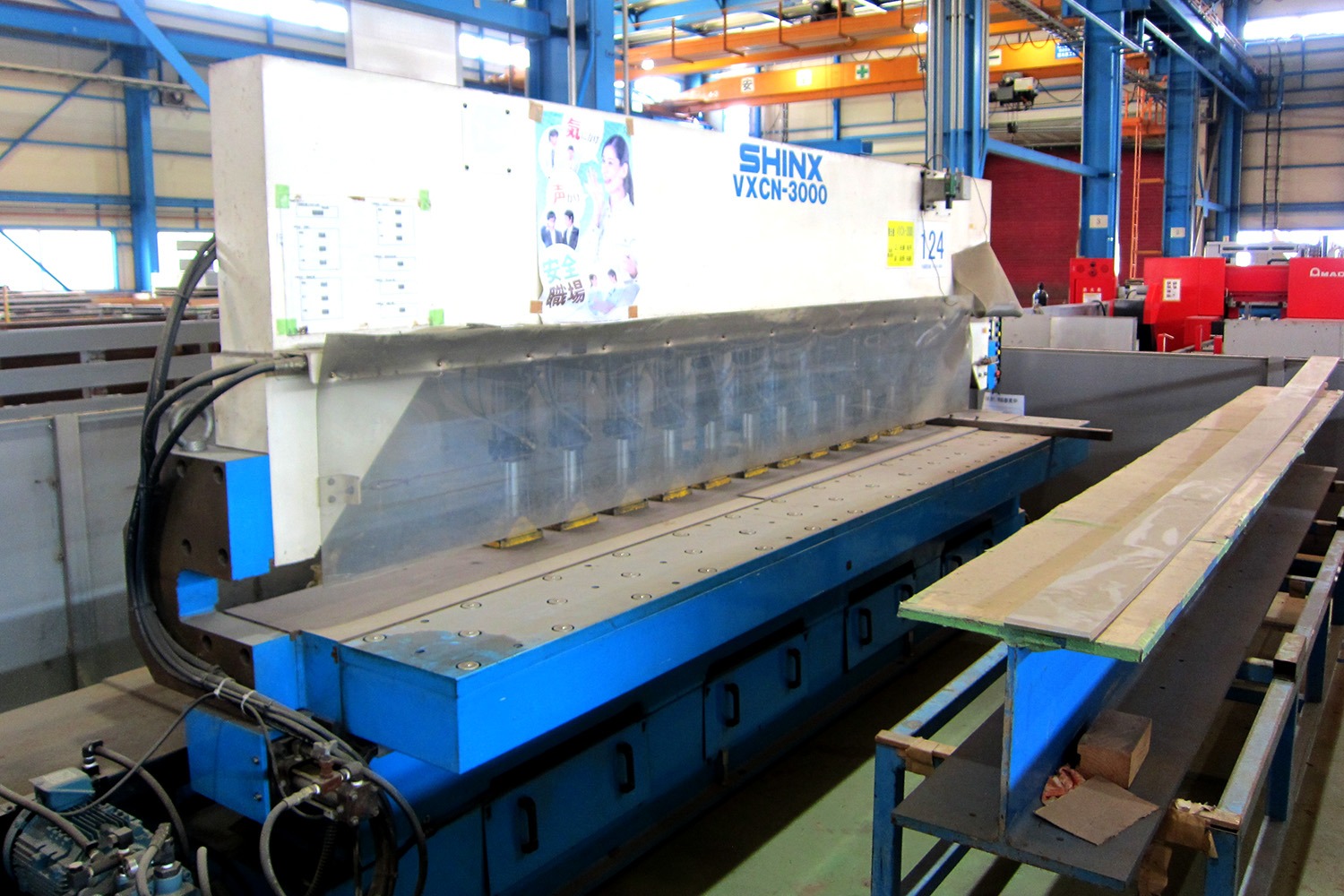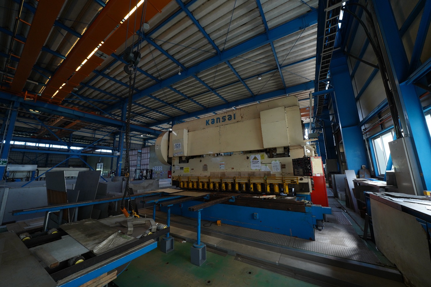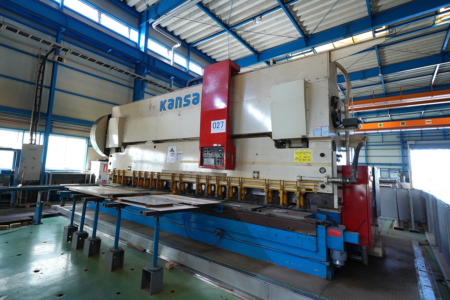 メーカー (株)関西鐵工所 部門 素材切断部門 機種 シャーリング 仕様 最大ワーク寸法:幅4m/6m 工場クレーン最大:5.0t 内容 間口サイズ4mと6mがあり、ハサミで紙を切るように上下の刃で金属板を挟み込むようにして連続で切断できる切断機です。 切断能力:板厚1mm~12mm 建築物内装用部材の切断の連続切断が可能です。 -