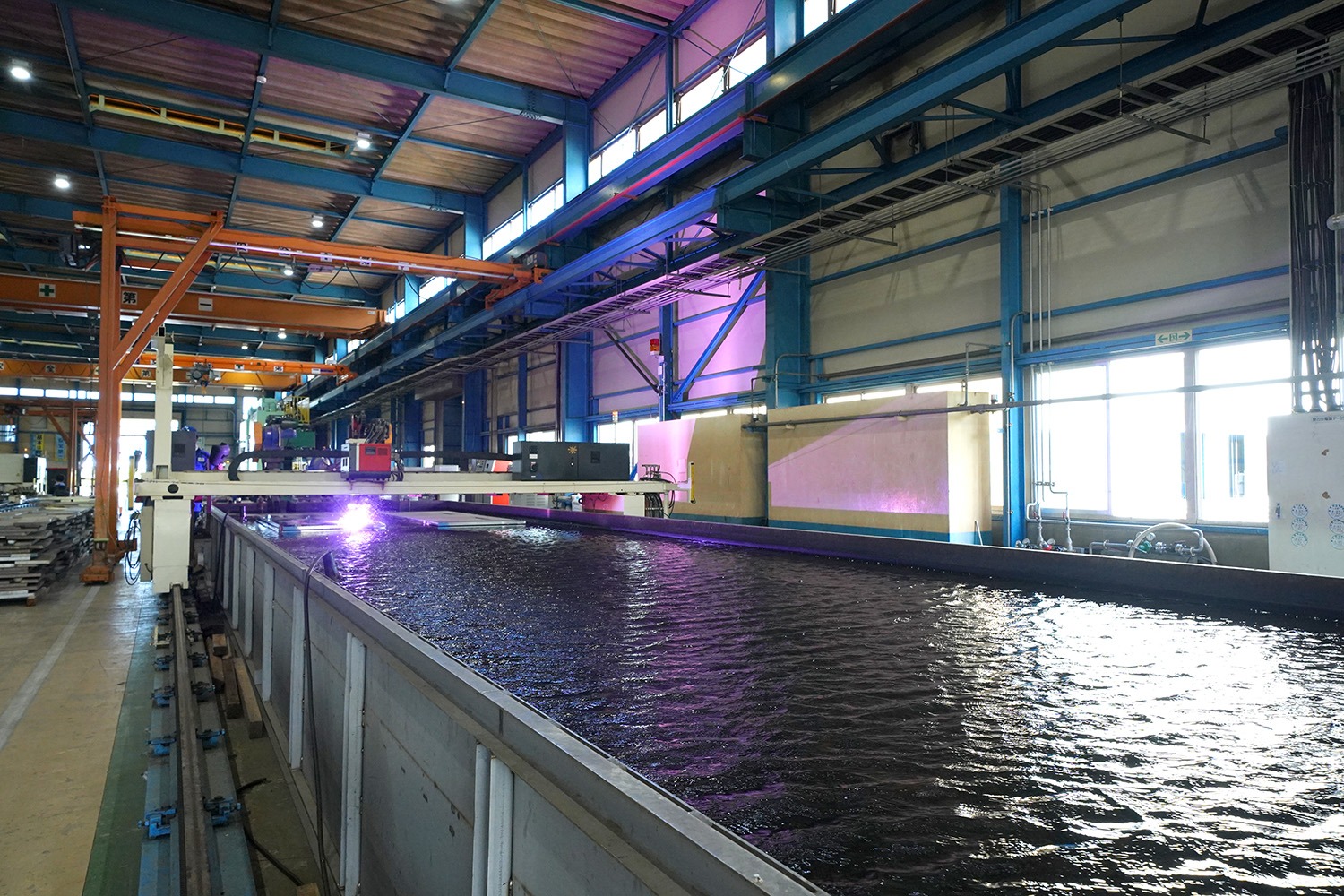 メーカー 小池酸素工業(株) 部門 素材切断部門 機種 プラズマ 仕様 テーブルサイズ:3.2m×9m 出力:800A 工場クレーン最大:10.0t 内容 水没させて切断する水プラズマ機です。板厚に応じて400A/600A/800Aの切り替えができます。水プラズマは水没状態で切断しますので、スラグの付着や熱歪みも少なく、高熱による焦げ色がありません。 切断能力:板厚16mm~30mm(400A)、板厚20mm~50mm(600A)、板厚40mm~80mm(800A) 最大製品サイズ:3m×7m -